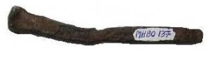 **El joven Marinero Manuel Higueras, efectivo del Destacamento que Prefectura Naval Argentina posee en el Parque Histórico Natural Vuelta de Obligado, se encontraba realizando tareas de mantenimiento cuando halló un objeto de hierro de unos 5 cm de longitud y otros 5 cm de ancho. Con una forma discoidal en un extremo y una barra de sección cuadrangular en el otro muestra a las claras que se trata de un fragmento de un gran remache de hierro con un avanzado estado de oxidación.
